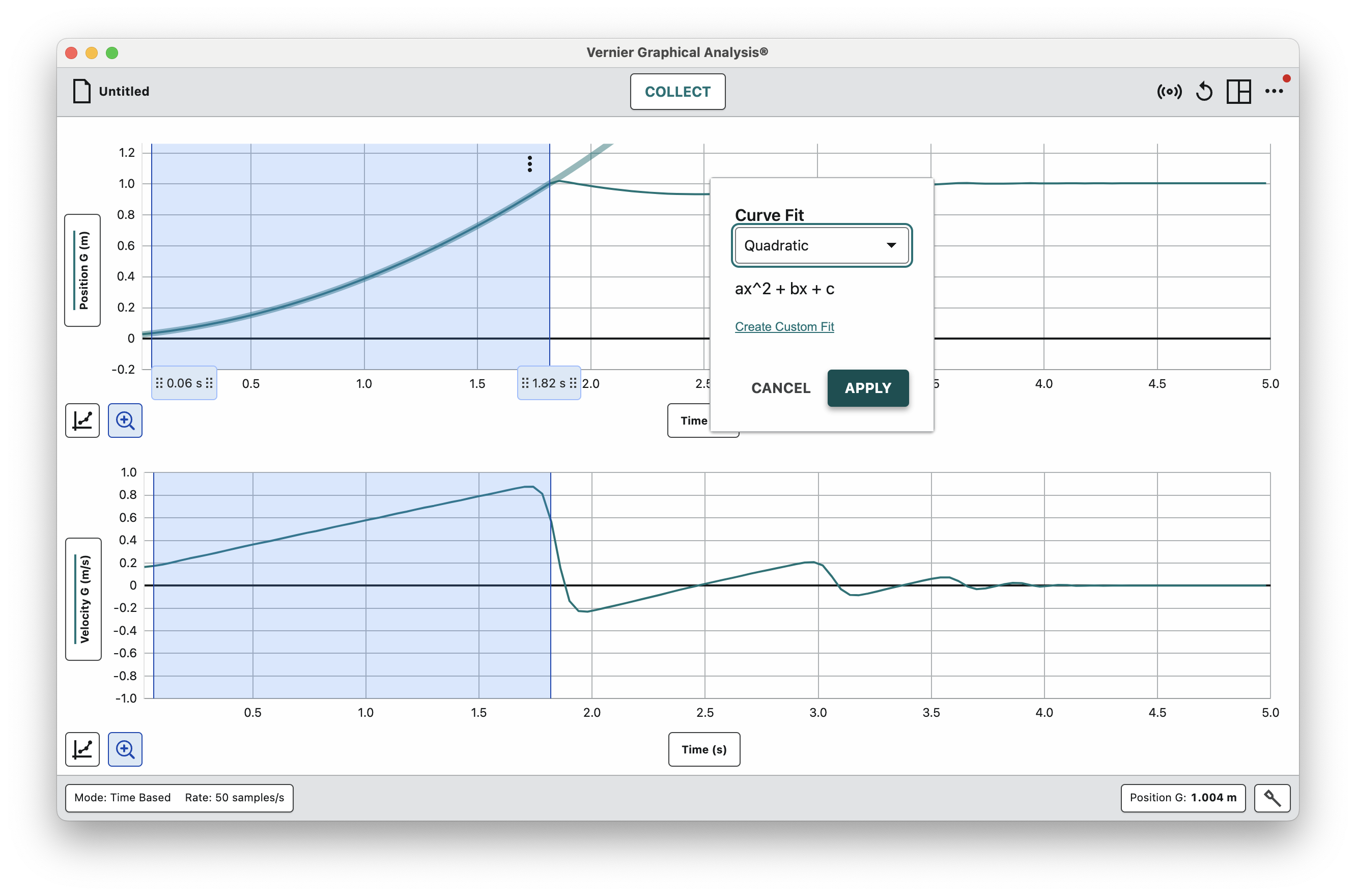 Click and drag on the Position graph to select the first parabola on your graph. From the menu that appears, select Apply Curve Fit then choose Quadratic, and apply.