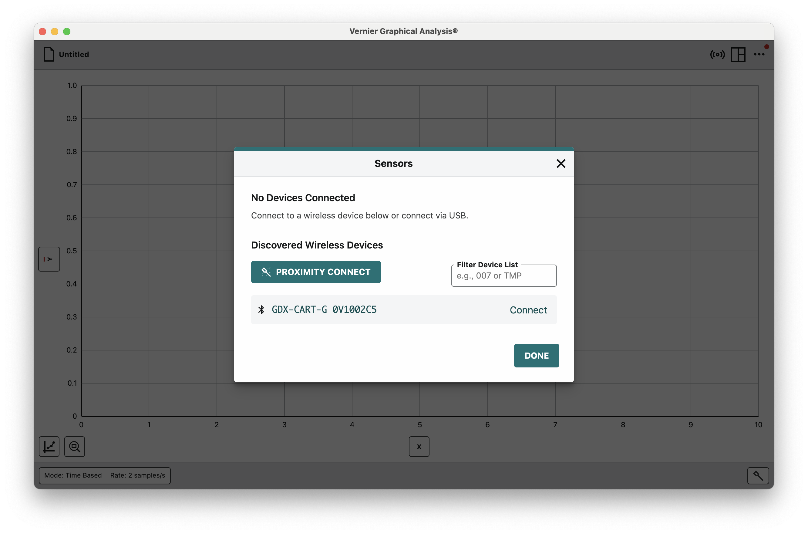Select your sensor cart from the Sensors menu and press Connect. The serial number should be printed on the cart, next to the power button. Once your cart is selected, press Done.