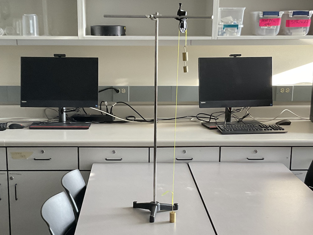 Using your phone's camera, record the motion of the 200g mass as you let it fall. Be sure that the camera is held steady, and that the entire meter stick is in frame. For best results, the camera should be as far away from the atwood machine as reasonably possible.